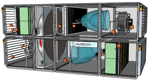 Sustain’air a conçu un système de traitement d’air qui fonctionne en 100% d’air neuf et sans recyclage d’air, évitant ainsi la contamination de l’air neuf par l’air extrait.