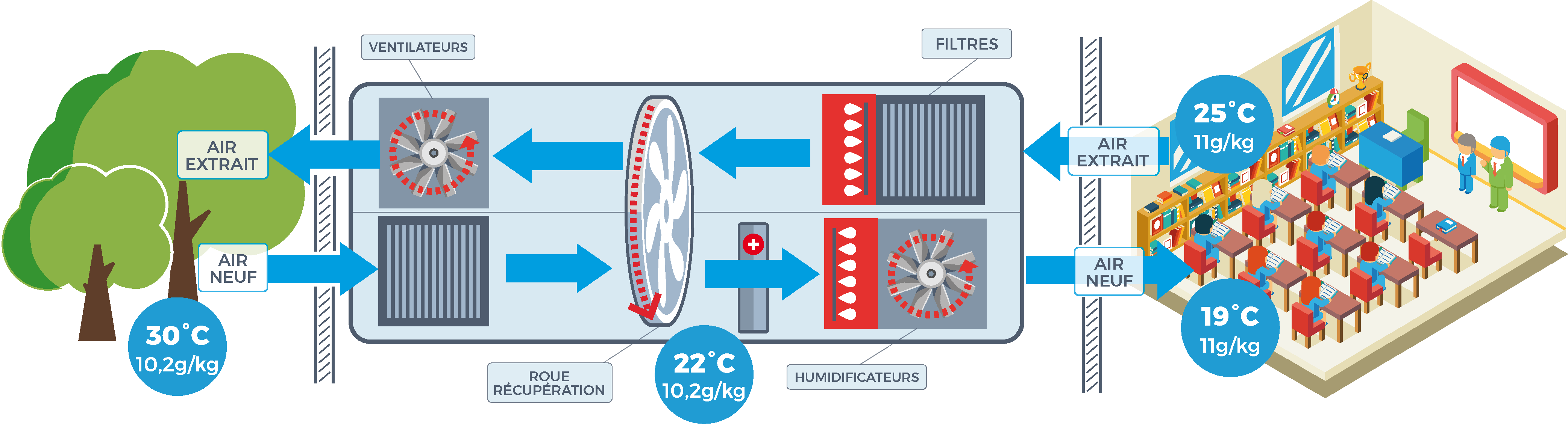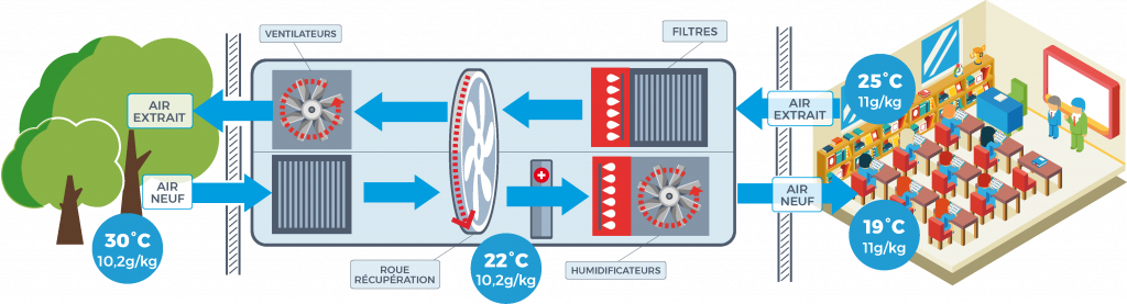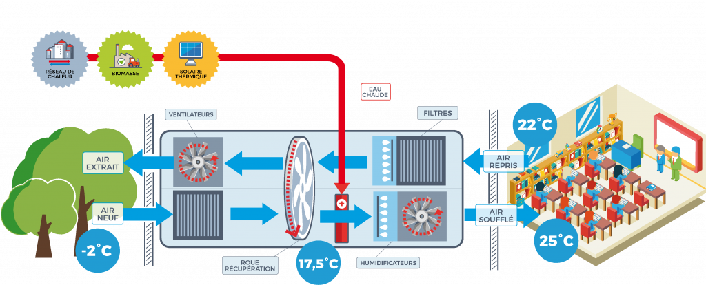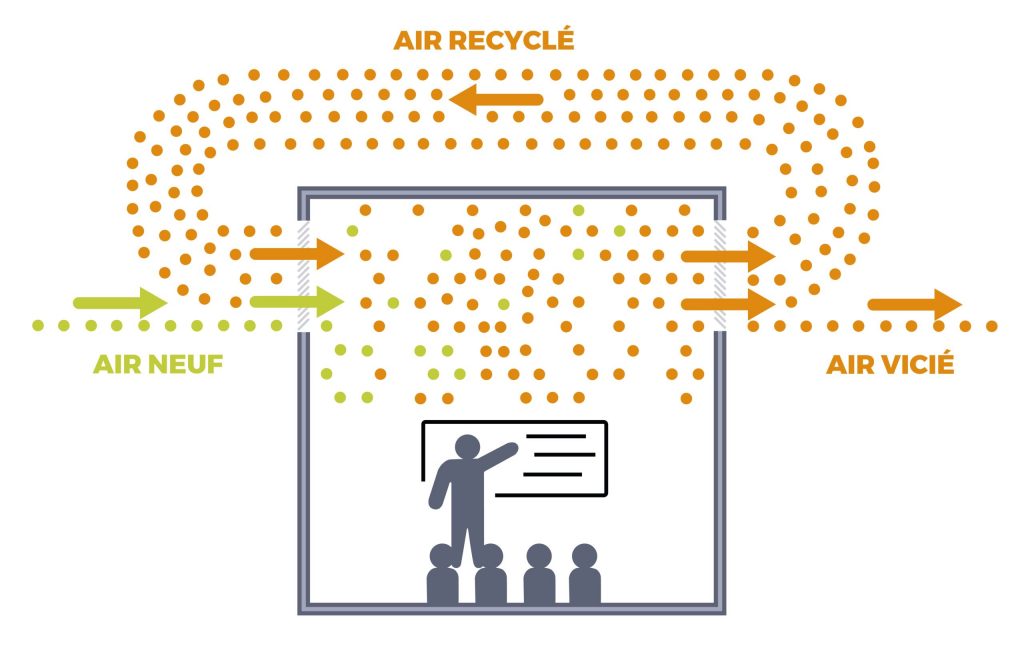 Les systèmes de traitement d’air actuellement utilisés fonctionnent en recyclage d’air afin de réaliser des économies d’énergies. Cependant, recycler l’air extrait du bâtiment peut contaminer l’air neuf avec des virus ou bactéries et le recyclage de l’air peut provoquer une accumulation des polluants dans l’air.
