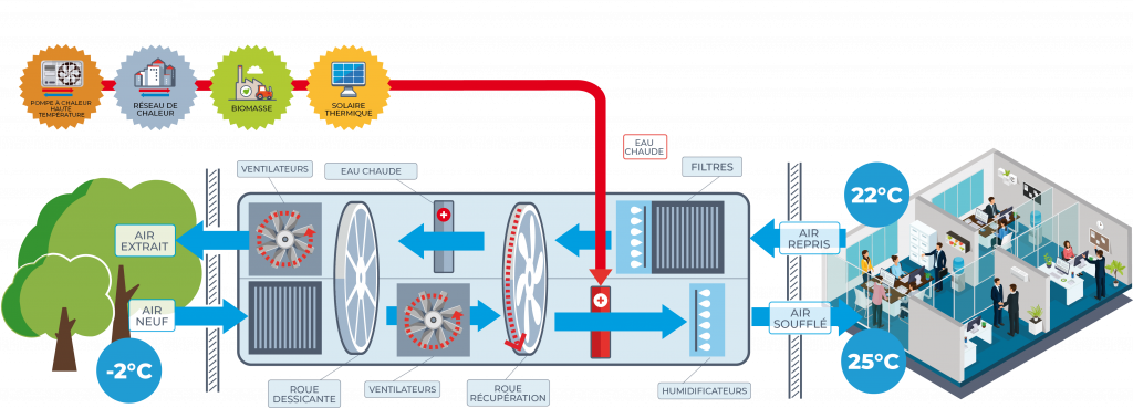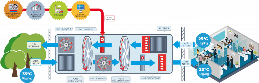 Les systèmes de traitement d’air actuellement utilisés fonctionnent en recyclage d’air afin de réaliser des économies d’énergies. Cependant, recycler l’air extrait du bâtiment peut contaminer l’air neuf avec des virus ou bactéries et le recyclage de l’air peut provoquer une accumulation des polluants dans l’air qui peut s’avérer néfaste pour la santé des usagers.